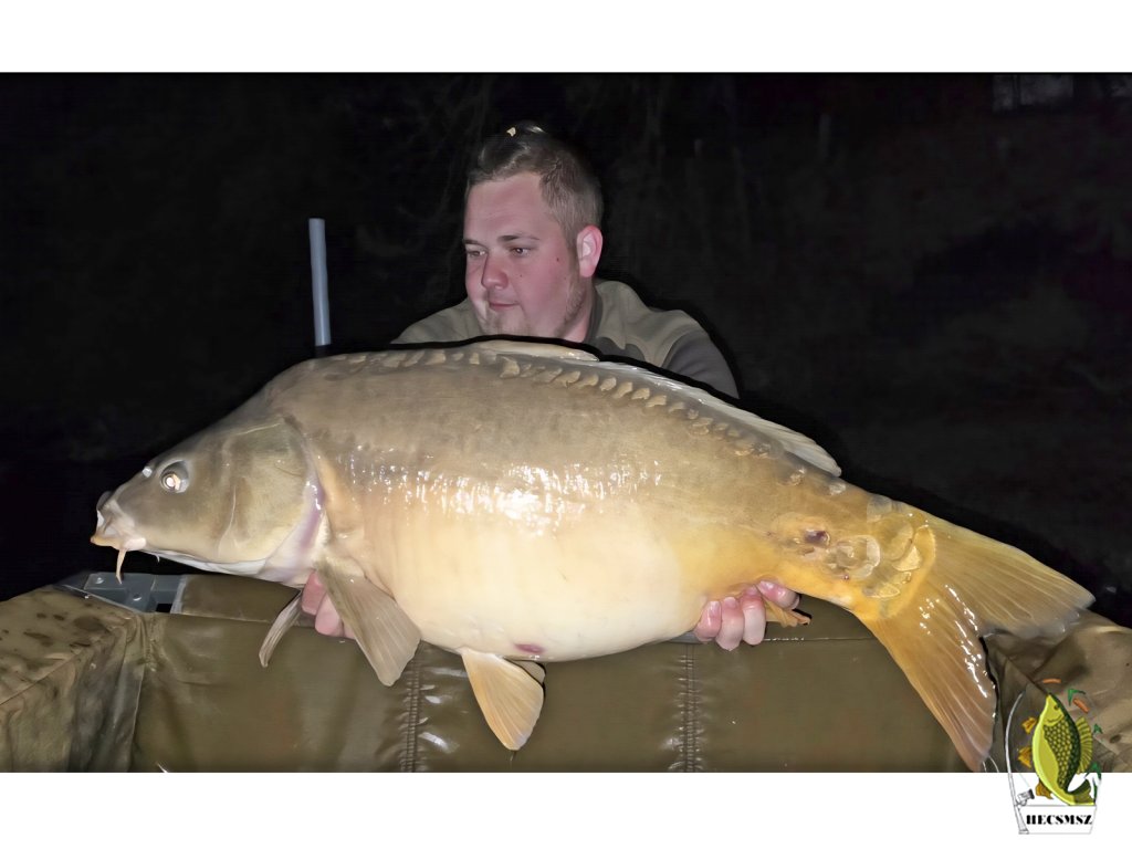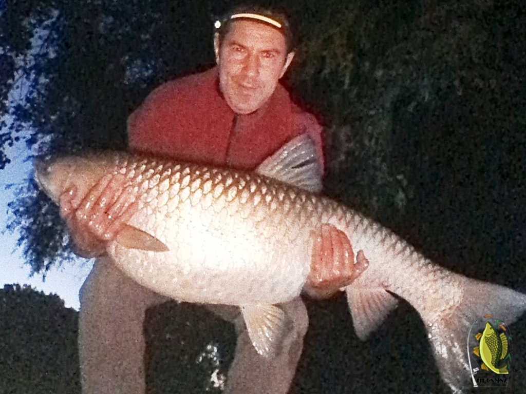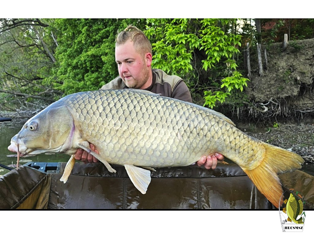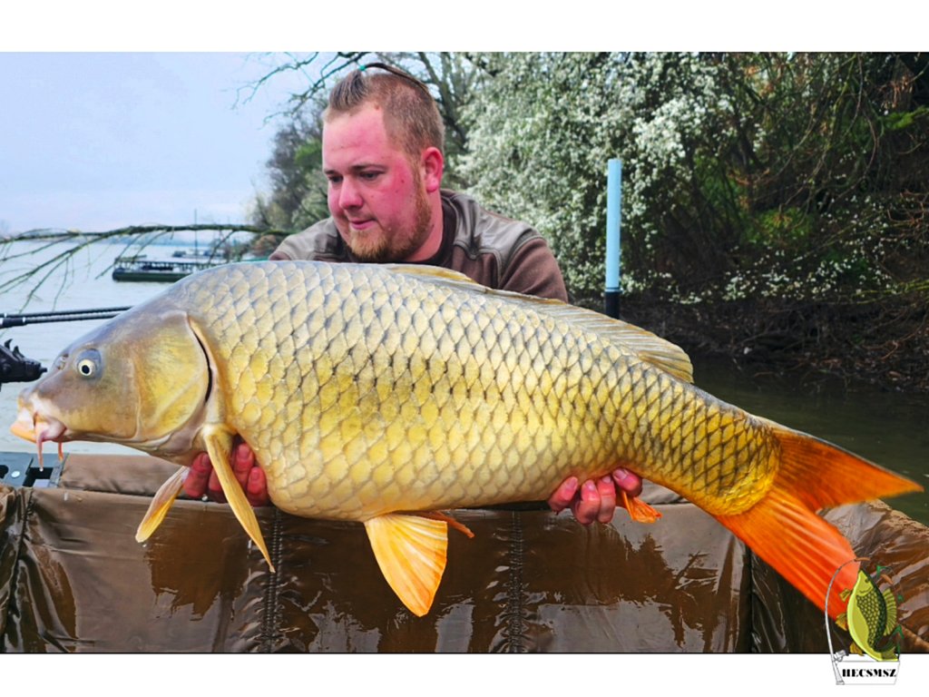 Egy délben érkezett kapásra vágtam be, a hal megállt a meder közepén majd egy percig és utána megindult, akkor éreztem hogy nagy lesz. Csónak nélkül a partról fárasztottam jó 20 percet, a végén már derékig kellett hogy a vízben álljak, hogy ne vigye bele a nádba és a tökbe. 20mm fűszeres fokhagymás bojlira csábult el.